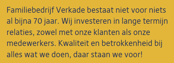 Als echt Vlaardings familiebedrijf dat dit jaar 70 jaar bestaat, is Verkade voor velen een naam die je niet hoeft uit te leggen. Iedereen in Vlaardingen en omstreken kent Verkade, van jong tot oud. Het is een bedrijf dat al generaties lang zichtbaar is in onze stad en een vaste waarde in de buurt.
